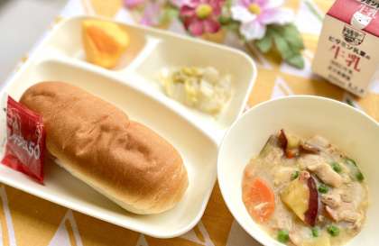 きょうの献立は、コッペパン、鶏肉とさつまいものシチュー、はくさいのピクルス、かき(平核無柿)、いちごジャム、牛乳でした。