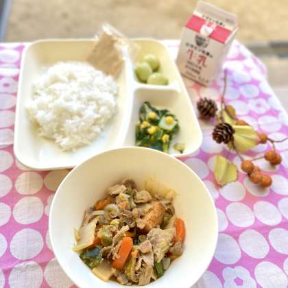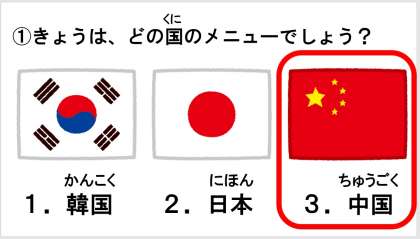 ジャージャンどうふは中国の料理です。「家常豆腐」と書き、家庭で常によく食べられている料理です。きょうの給食では、豚肉を主材に、あつあげ、はくさい、にんじん、たけのこ、ピーマン、白ねぎ、しいたけを使用し、トウバンジャンで辛味をきかせています。