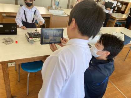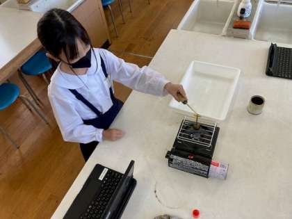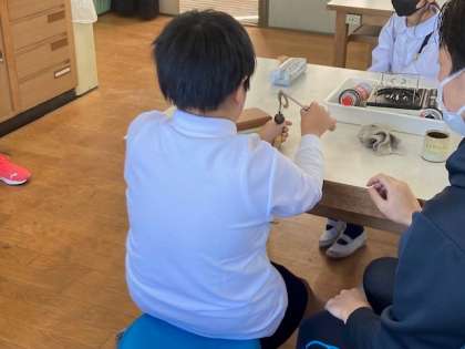 「金属も温度によって体積が変わるのだろうか」の学習です。実験では、鉄の球をガスコンロで熱した後と水で冷やした後、輪っかを通りぬけるかどうかを調べました。