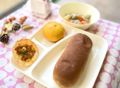 きょうの献立は、黒糖パン、豚肉と野菜のスープ煮、変わりピザ、みかん、牛乳でした。