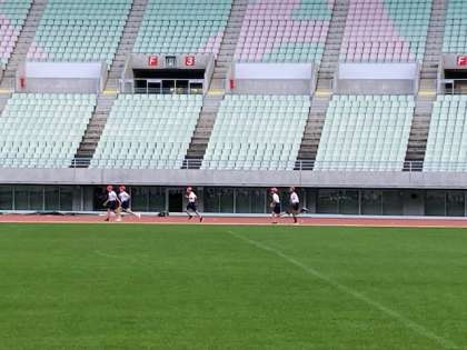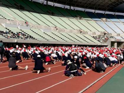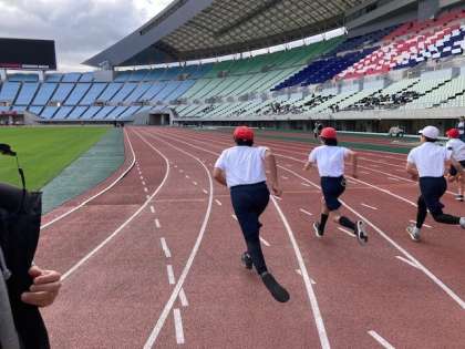 19日(火)ヤンマースタジアム長居とヤンマーフィールド長居の2か所を使って、スポーツ交歓会が行われました。午前中は、スタジアムで陸上競技を行いました。