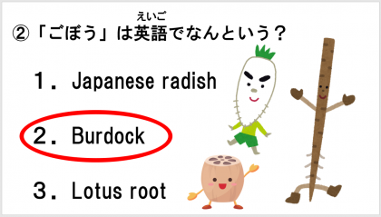 シェーン先生といっしょに、英語のクイズもしました。ごぼうは、外国ではあまり食べられることがないそうです。