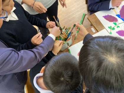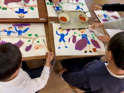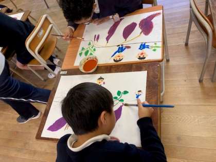「いもほり」の絵を描いています。今日は、土の色をぬりました。