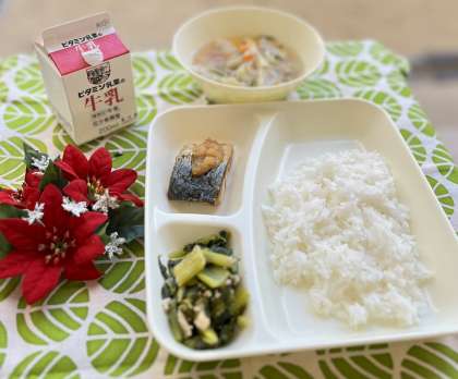 きょうの献立は、ごはん、さばのおろしじょうゆかけ、五目汁、こまつなの煮びたし、牛乳でした。
