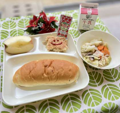 きょうの献立は、おさつパン、とうふローフ、カリフラワーのスープ煮、りんご、牛乳でした。