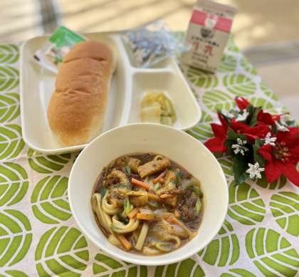 きょうの献立は、コッペパン、カレーうどん、はくさいのおひたし、ミニフィッシュ、ソフトマーガリン、牛乳でした。