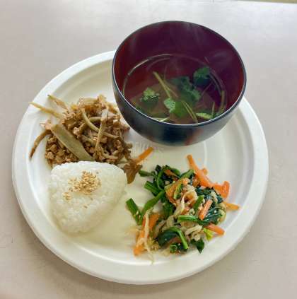 献立は、牛肉の時雨煮おにぎり、よごし、おすましです。(牛肉は大豆ミートで代用しました。)