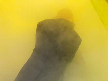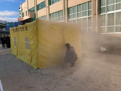 煙テント体験の様子です。1年生児童は、少し怖がっていたようです。