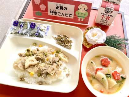 きょうの献立は、れんこんのちらしずし、ぞう煮、ごまめ、牛乳でした。正月の行事献立です。
