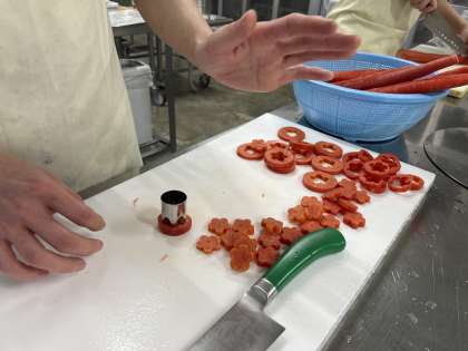 ぞう煮は、鶏肉、しらたまもち、さといも、だいこん、金時にんじん、みつばが入った関西風の白みそ仕立てです。金時にんじんは全て、お正月らしくお花の型抜きをしていただきました。