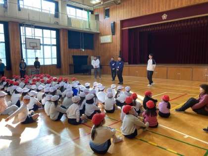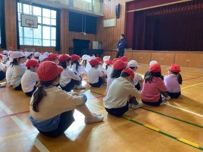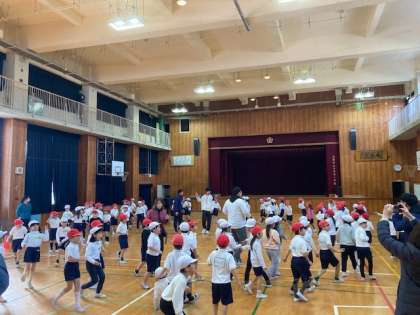 今日の2時間目と3時間目に九条東小学校の講堂で、学校間交流を行いました。九条東・九条南・九条北の3校の1年生が集まりました。