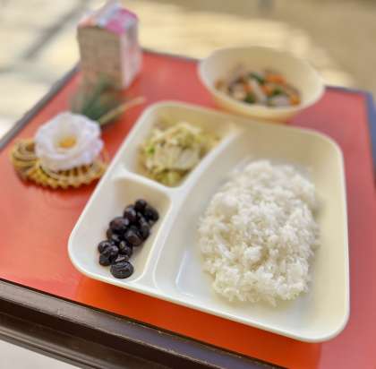 きょうの献立は、ごはん、筑前煮、ツナとキャベツのごまいため、黒豆の煮もの、牛乳でした。