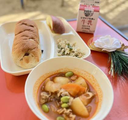 きょうの献立は、レーズンパン、ケチャップ煮、ささみと野菜のソテー、りんご、牛乳でした。
