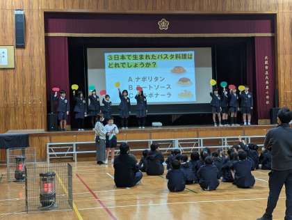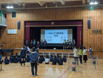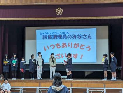 今日は、けんこう委員会の発表と給食調理員の皆さんにお礼の手紙を渡しました。
