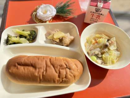 きょうの献立は、黒糖パン、鶏肉とじゃがいものガーリック焼き、スープ煮、ブロッコリーのサラダ、牛乳でした。