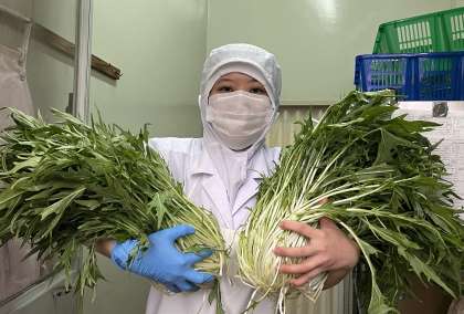 みずなは年に1回しか給食に登場しません。とっても大きな水菜が福岡県から届きました。