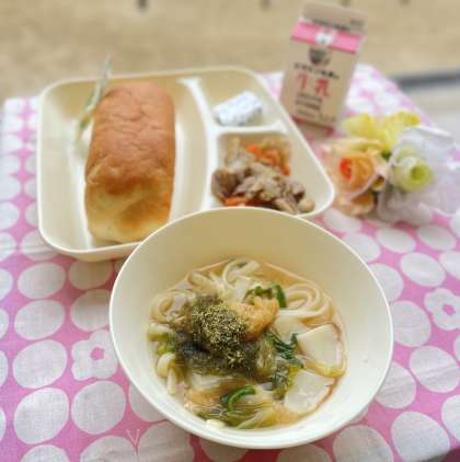 きょうの献立は、コッペパン、豚肉とごぼうの煮もの、なにわうどん、固形チーズ、ソフトマーガリン、牛乳でした。