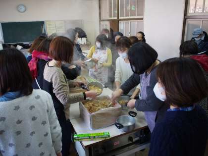 連合女性部と本校PTAの役員・委員さんで家庭科室でアルファ化米の炊き出しが行われました。お湯を入れるだけで20分ぼどで出来上がるアルファ化米をラップで一口サイズにに包んでくださり、参加者や児童が試食しました。