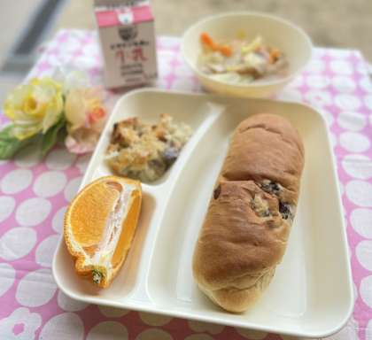 きょうの献立は、レーズンパン、押麦のグラタン、スープ、デコポン、牛乳でした。