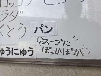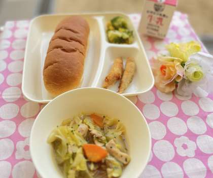 きょうの献立は、黒糖パン、わかさぎフライ、スープ煮、ブロッコリーとコーンのサラダ、牛乳でした。