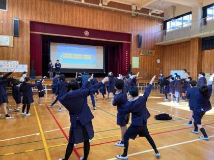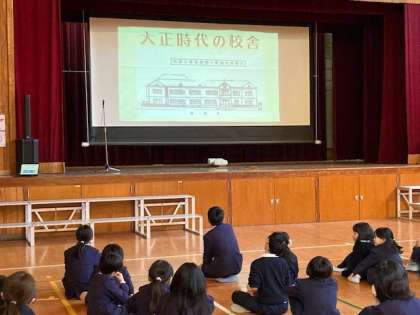 次に、6年生が作成してくれた「九条東小学校150周年のあゆみ」のビデオを見ました。その後は「学校クイズ」を行いました。