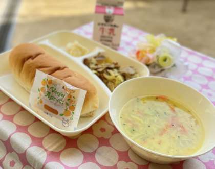 きょうの献立は、コッペパン、豚肉のカレー風味焼き、コーンスープ、カリフラワーのピクルス、アプリコットジャム、牛乳でした。