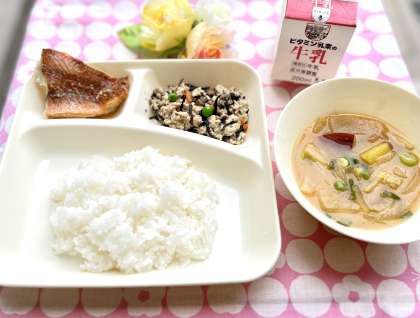 きょうの献立は、ごはん、あかうおのレモンじょうゆかけ、さつまいものみそ汁、高野どうふのいり煮、牛乳でした。
