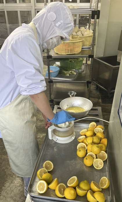 きょうのレモンは広島県から届きました。給食室でていねいにしぼっています。「レモンじょうゆ」として、あかうおにかけました。