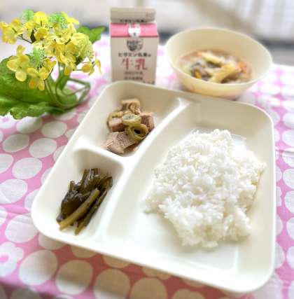 きょうの献立は、ごはん、まぐろの甘辛焼き、豚汁、くきわかめのつくだ煮、牛乳でした。