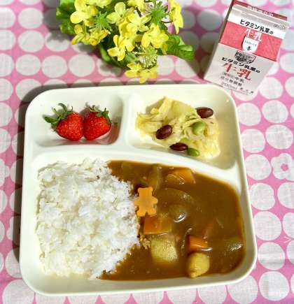 きょうの献立は、チキンカレーライス、ビーンズサラダ、いちご、牛乳でした。