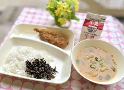 きょうの献立は、ごはん、いわしフライ、みそ汁、牛ひじきそぼろ、牛乳でした。