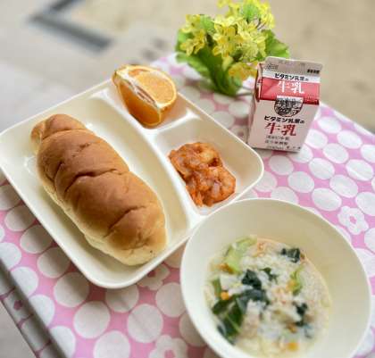 きょうの献立は、おさつパン、えびのチリソースいため、中華がゆ、デコポン、牛乳でした。