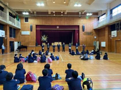 新年度がスタートしました。嬉しいことに児童の欠席者はゼロでした。初めに着任の先生方を紹介しました。8人の新しい先生を紹介しました。