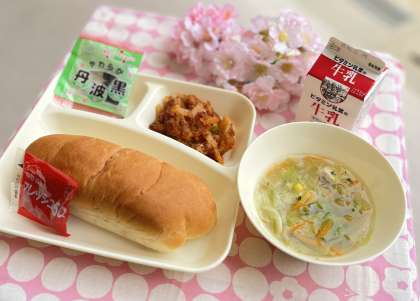 きょうの献立は、コッペパン、じゃがいものミートグラタン、レタスのスープ、ソフト黒豆、いちごジャム、牛乳でした。