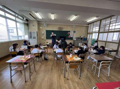 1年生は担任の先生から、パンにジャムをつける方法を教えてもらっていました。