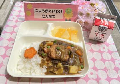 きょうの献立は、カツカレーライス、フルーツゼリー、牛乳でした。入学祝い献立です。1年生の入学と、2〜6年生の進級をお祝いする気持ちで食べました。
