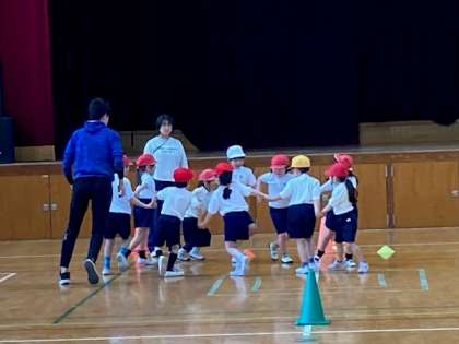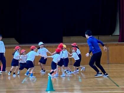 手をつないで輪になります。鬼にタッチされないように、回転しながら鬼から友だちを守っているところです。