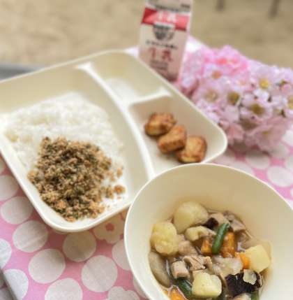 きょうの献立は、ごはん、鶏肉とじゃがいもの煮もの、あつあげのしょうゆだれかけ、紅ざけそぼろ、牛乳でした。