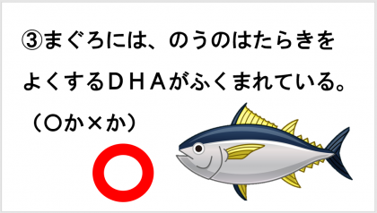 給食時間は、まぐろについてのクイズをしました。まぐろには、脳の働きをよくする「DHA(ドコサヘキサエン酸)」や、血液の流れをよくする「EPA(エイコサペンタエン酸)」がふくまれています。