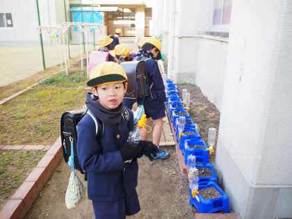 急に寒さが厳しくなった今週、月曜日には運動場の池にも氷が張りました。しかし、1年生が植えたチューリップの球根からは芽がくんぐん伸びてきています。子ども達は登校するとうれしそうに水やりをしています。厳しい寒さに耐えて、植物は春には花を咲かせます。寒さに負けず、子ども達にも力を蓄えさせていきましょう。