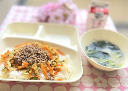 きょうの献立は、ビビンバ、トック、牛乳でした。韓国・朝鮮の料理です。人気の献立で、朝から楽しみにしている子も多かったです。