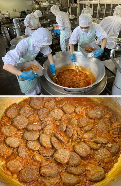 たまねぎとマッシュルーム、ケチャップ、ウスターソースで作ったソースでじっくりと煮こんだハンバーグは、子どもたちに大人気でした。