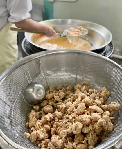 きょうの献立は、ごはん、鶏肉のたつたあげ、五目汁、キャベツの梅風味、牛乳でした。