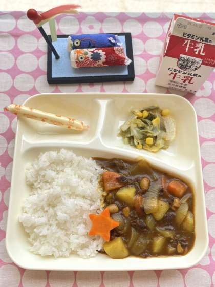 きょうの献立は、牛肉と大豆のカレーライス、レタスとコーンのサラダ、棒チーズ、牛乳でした。