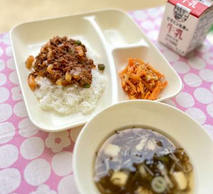 きょうの献立は、タコライス、とうふともずくのとろり汁、にんじんしりしり風、牛乳でした。