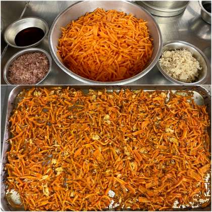 給食では、にんじんの他にささみ、かつおぶしを使用し、みりん、こいくちしょうゆで味付けして焼き物機で焼いて作りました。