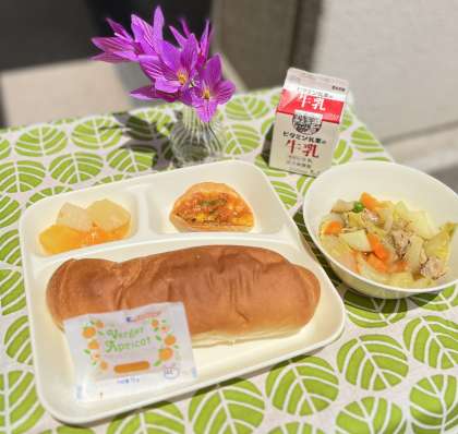 きょうの献立は、コッペパン、豚肉と野菜のカレースープ煮、変わりピザ、ミックスフルーツ(缶)、アプリコットジャム、牛乳でした。