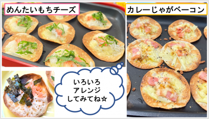 変わりピザは、ぎょうざの皮の上に、ツナ、チーズ、ピーマン、コーン、ピザソースを合わせた具をのせて、焼き物機で焼いて作っています。おうちでもホットプレートやフライパンで簡単にできるので、ぜひやってみてください。