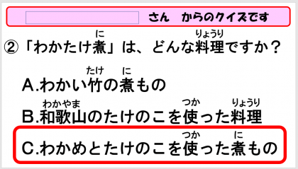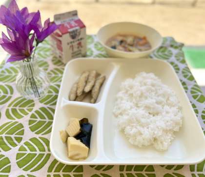 きょうは、大阪産のたけのこが届きました。わかめといっしょに煮た「わかたけ煮」は、春の味がしてとてもおいしかったです。「おいしくってもうなくなっちゃった〜!」と、子どもたちにも大好評でした。