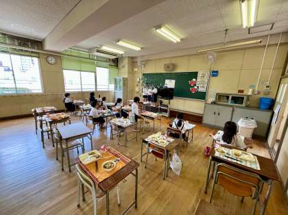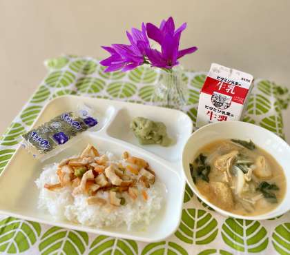 きょうの献立は、かやくご飯、みそ汁、まっ茶ういろう、牛乳でした。